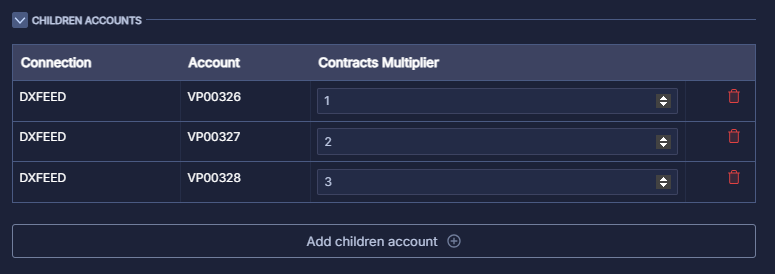 In addition you can choose how much to multiply contracts by depending on the Child account selected. The copier will multiply the contracts of the Parent account's orders by the Contracts Multiplier.